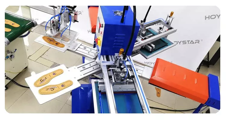 Automatický dvoubarevný sítotiskový stroj pro vložku do bot s 6ks pracovní stanicí a 2ks sušícím systémem