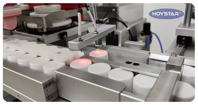 Stroj je nakonfigurován se systémem úpravy plamenem, který zlepšuje přilnavost inkoustu na povrchu uzávěru láhve a zlepšuje trvanlivost tisku.