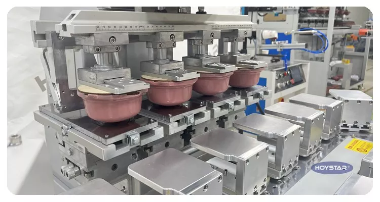 Jako profesionální výrobce v Číně bychom vám rádi poskytli vysoce účinnou čtyřbarevnou tamponovou tiskárnu HOYSTAR Big Size s dopravníkem. Tento stroj umožňuje souvislý čtyřbarevný tamponový tisk produktů, dokáže provést soutisk barev dokončený v jediném cyklu. Tento stroj využívá rotační otočný dopravníkový systém, který umožňuje nepřetržitý a hladký přenos produktu během tiskového procesu, schopnost dokončit plně 4barevný přetisk v jediném rotačním cyklu. Ve srovnání s tamponovými tiskárnami typu raketoplán je jeho rychlost velmi vysoká.