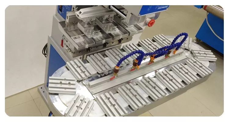 Velká čtyřbarevná tamponová tiskárna s dopravníkem s integrovaným obvodem SCM (jednočipový mikropočítač) naprogramuje akční sekvenci. S poloautomatickým i automatickým režimem se mohou operátoři přizpůsobit různým potřebám výroby.