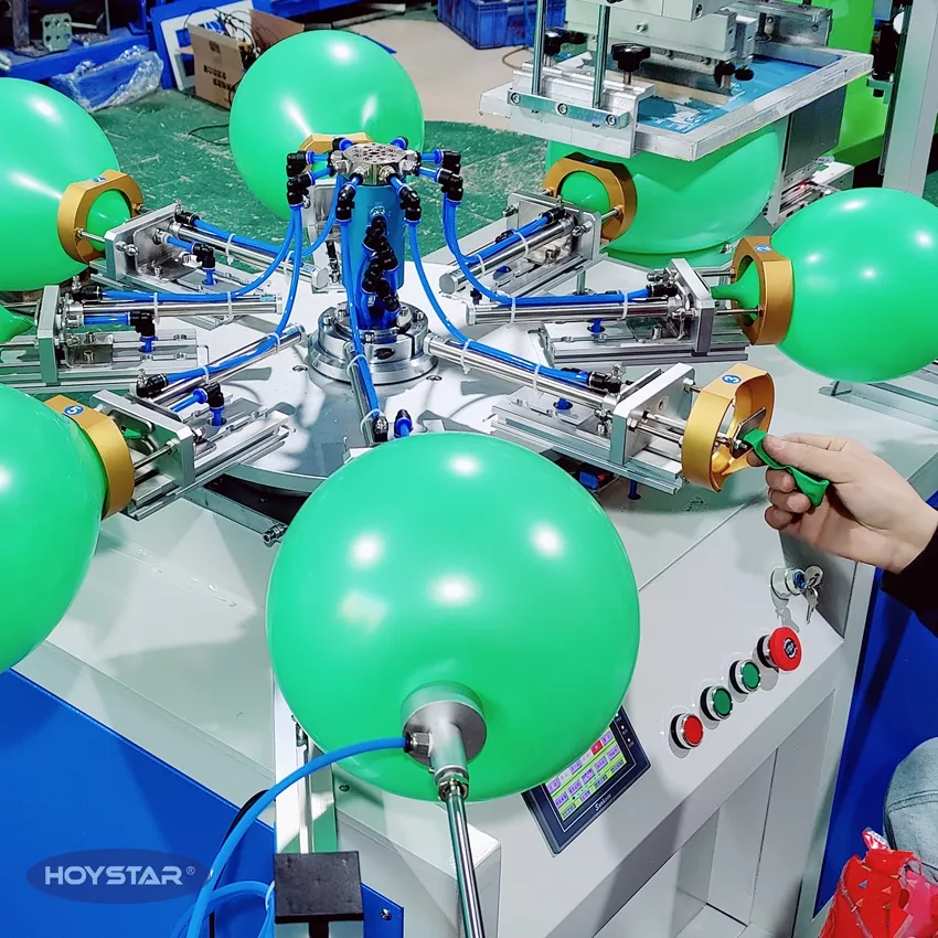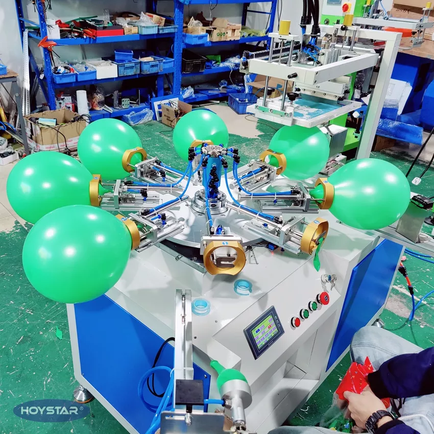 Jako profesionální výrobce v Číně bychom vám rádi poskytli vysoce účinný sítotiskový stroj HOYSTAR s jednobarevným latexovým balónkem. Naše stroje využívají ovládání PLC a dotykové obrazovky a používají se především pro tisk různých typů latexových balónků. Stroj může tisknout na 4 strany balónků a je dodáván se sušicí troubou, která dobře vysuší inkoust.