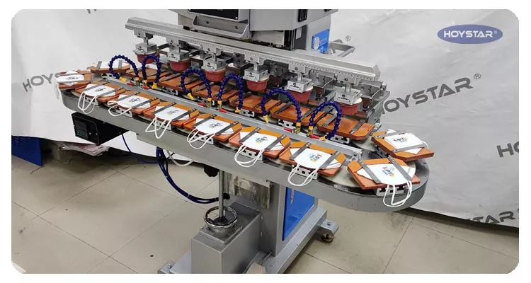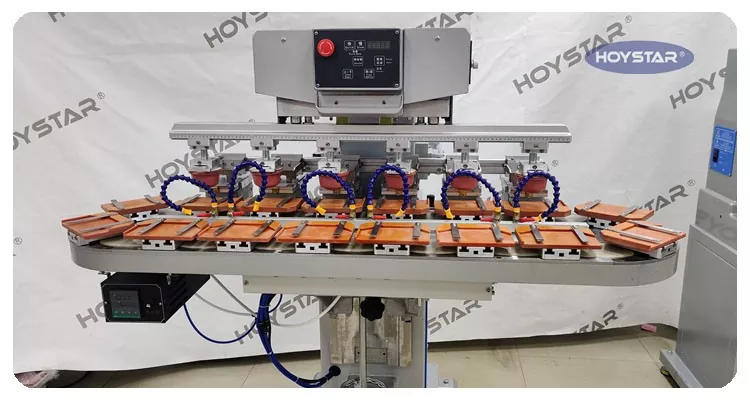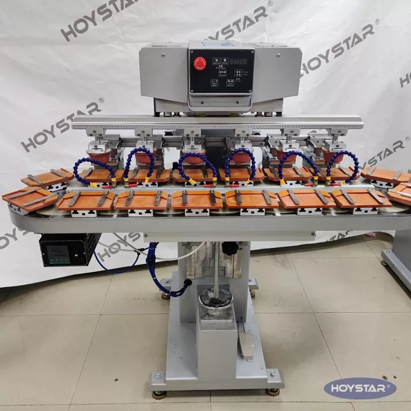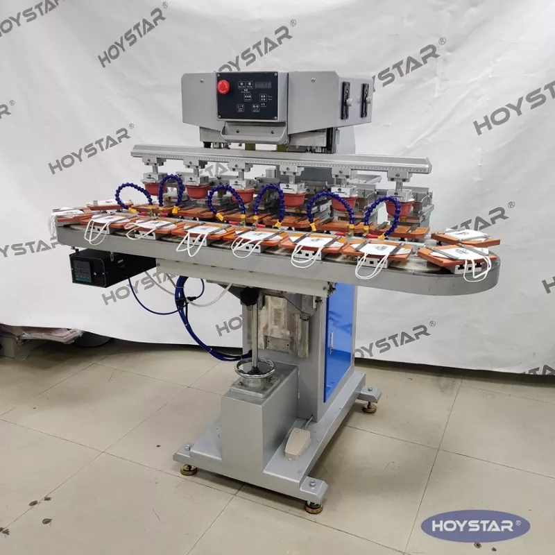 Jako profesionální výrobce v Číně bychom vám rádi poskytli vysoce účinnou šestibarevnou tamponovou tiskárnu HOYSTAR s dopravníkem. Tento stroj umožňuje nepřetržitý šestibarevný tamponový tisk produktů, přičemž soutisk jedné barvy je dokončen v jediném cyklu. Tento stroj využívá rotační otočný dopravníkový systém, který umožňuje nepřetržitý a hladký přenos produktu během tiskového procesu, schopnost dokončit plně 6barevný přetisk v jediném rotačním cyklu. Ve srovnání s tamponovými tiskárnami typu raketoplán je jeho rychlost velmi vysoká.